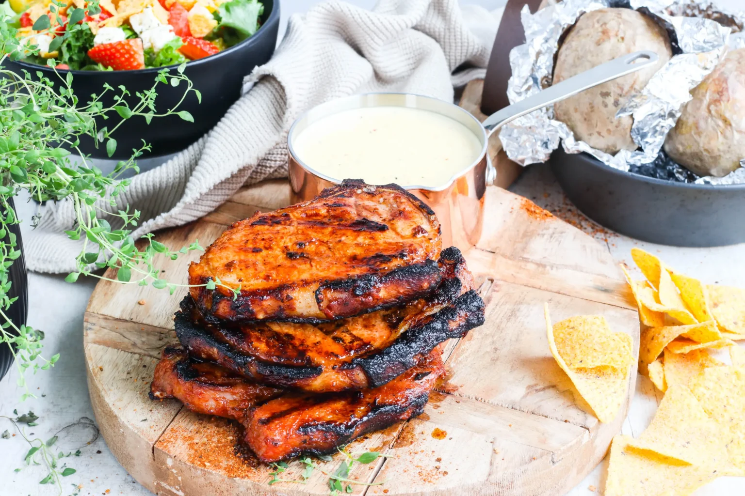 Tilvalið er að bera grísakótilettur í kryddlegi grillmeistarans fram með mexíkóostasósu, bakaðri kartöflu og sumarlegu salati.
