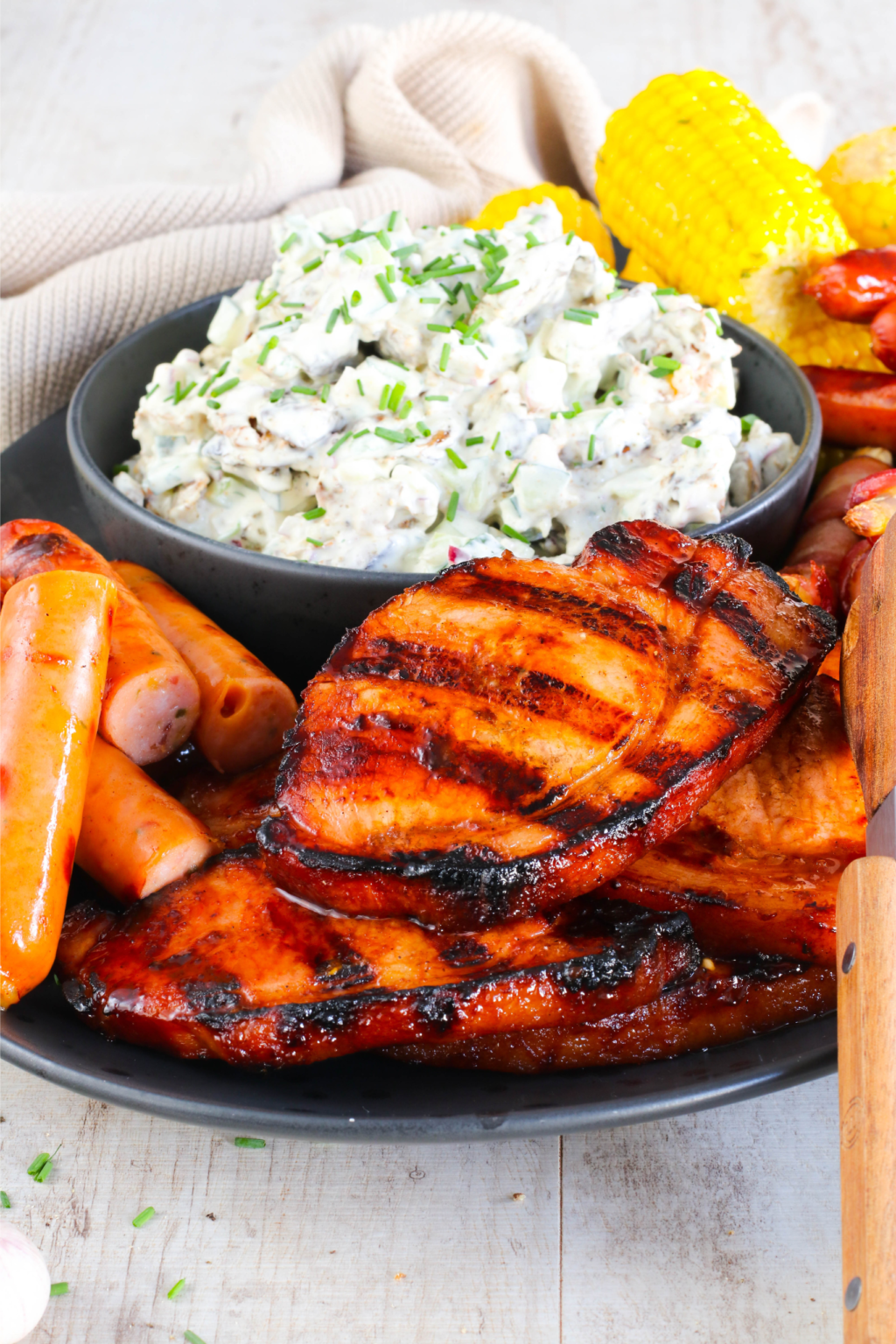 Grillið svínakótilettur og pylsur og sjóðið maís.