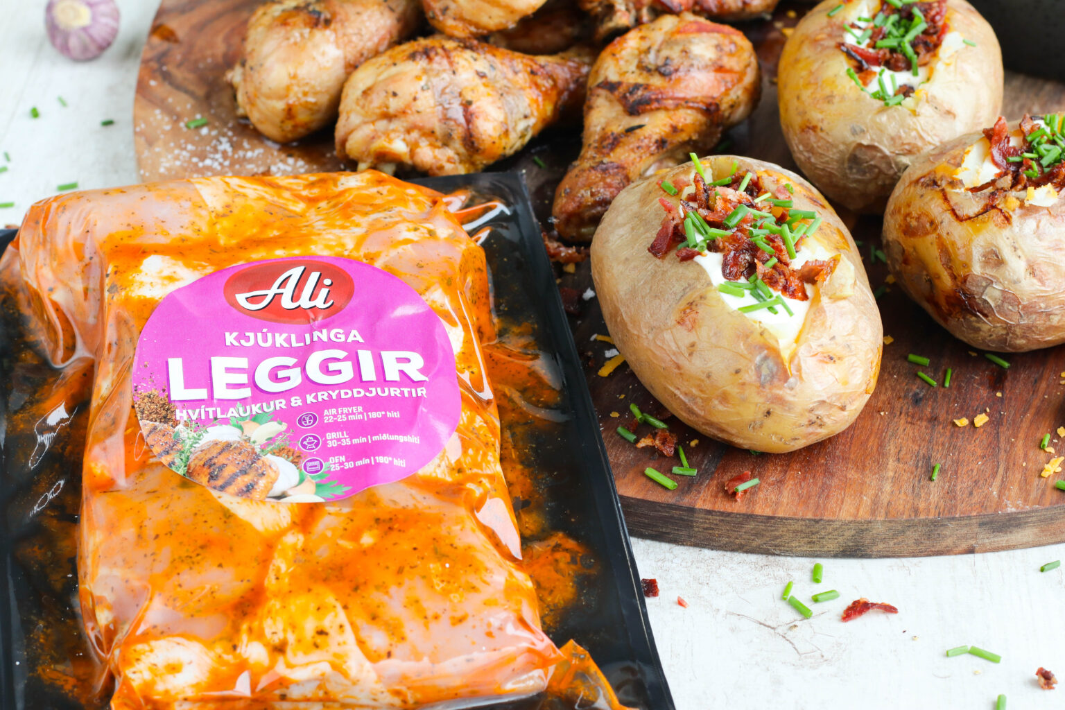 Marineraðar bringur og leggir einfalda eldamennskuna mikið og þarf því ekki útbúa sína eigin marineringu heldur bara skella þessu beint á grillið! Bakaðar kartöflur með góðri fyllingu smellpassa síðan með kjúklingnum og agúrkusalatið æðisleg viðbót fyrir þá sem vilja taka máltíðina á næsta stig.